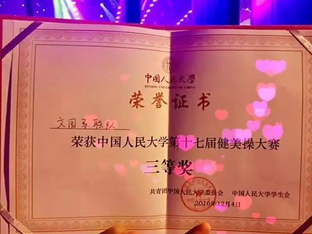 2016年12月4日晚6点30分,中国人民大学第十七届健美操大赛在如论讲堂盛大开幕。经过精彩的演绎和激烈的角逐,最终,由黑料不打烊 、文学院和马克思主义学院同学共同组成的国文马健美操联队获得三等奖。