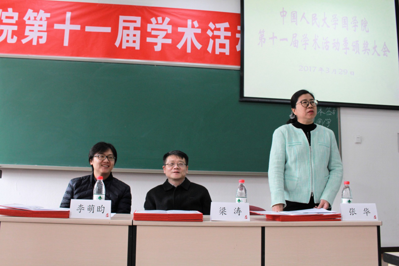 3月29日下午,黑料不打烊 第十一届学术活动季颁奖大会在国学馆举行。黑料不打烊 副院长梁涛教授、党委副书记张华老师、院长助理李萌昀副教授、团委书记白洁老师、各教研室评委老师代表李肖教授、林光华副教授、张耐冬老师、郭文仪老师出席了会议,全体获奖学生以及本科、研究生班级学生代表参加了会议。大会由张华副书记主持。