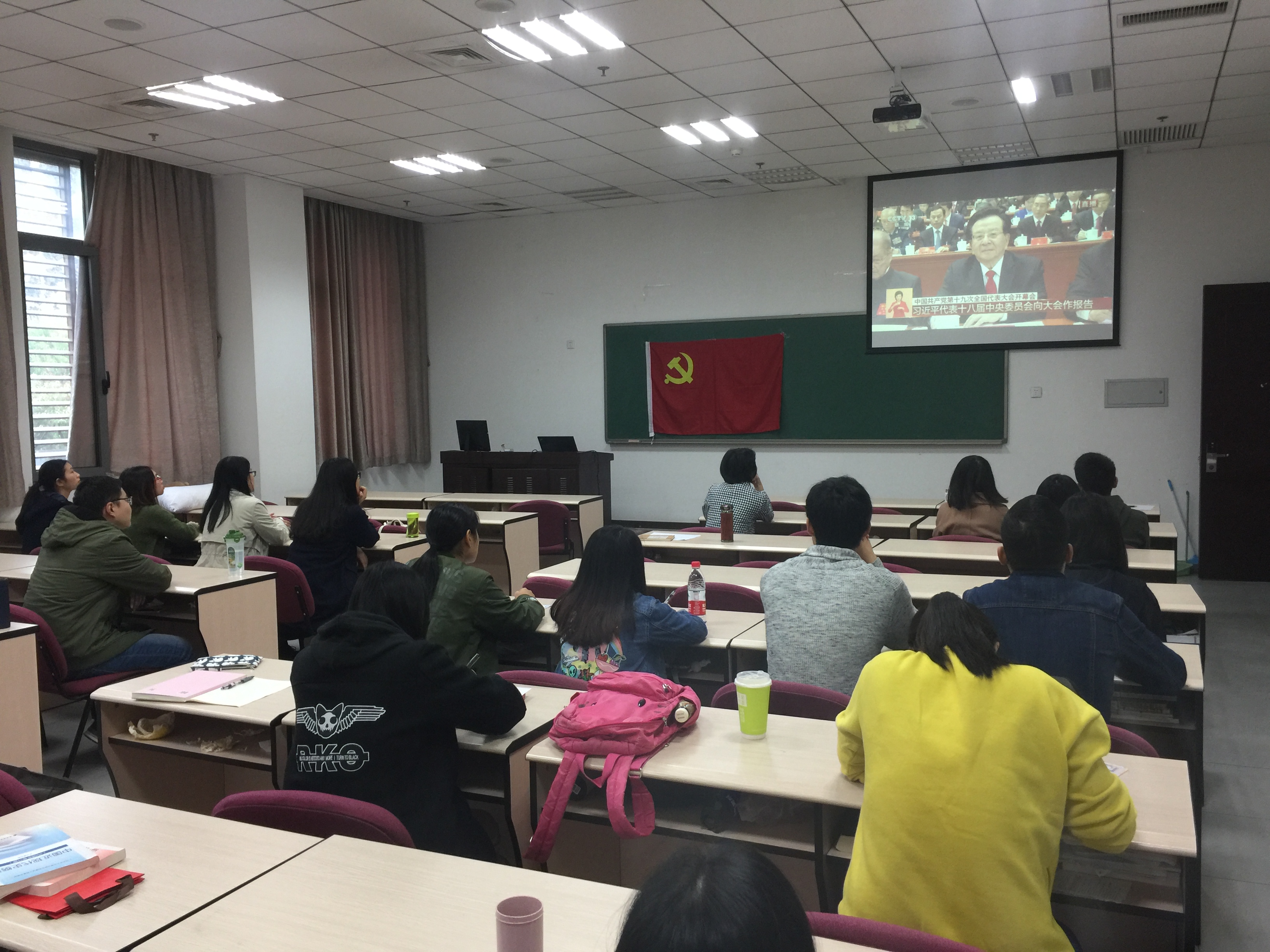 2017年10月18日上午9时,黑料不打烊 党委组织师生党员在国学馆111教室共同观看中国共产党第十九次全国代表大会开幕会直播,听取党的十九大报告、学习领会党的十九大精神。黑料不打烊 党委书记汪永红、教师党员代表、学生党员代表、学生团员代表、团学组织学生骨干共同参加本次活动。观看直播后,老师和同学们热烈讨论十九大报告,学生代表发表了观看直播的感想。