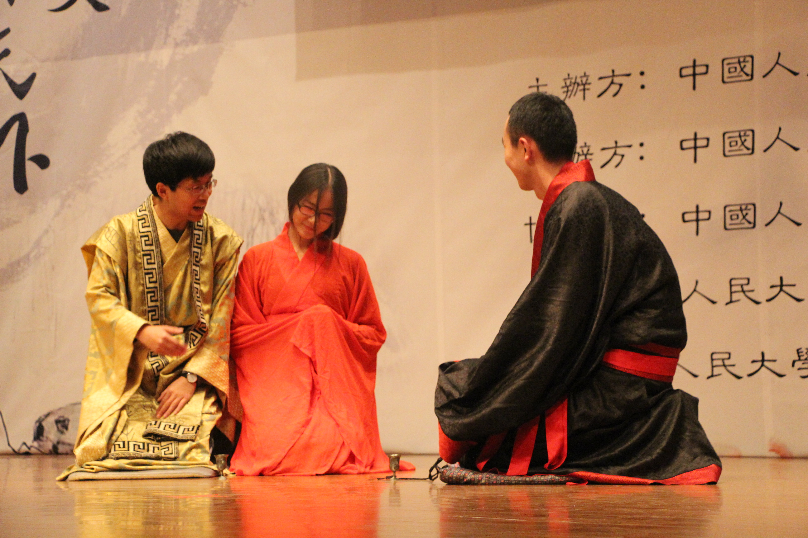 首先进行的是“人文演绎”环节。该环节要求参赛队伍根据历史事件进行剧本创作或改编,然后以舞台剧的形式加以演绎。闻经义队演绎的嵇康品格如玉,抱琴半醉,酣歌高眠;月映万川队展示了王司徒的连环妙计,暗中抛索,丝丝入扣,同时刻画了娇弱美丽的貂蝉,凤仪蝶舞,梳妆掷戟;国子文华队则华美而又浪漫地再现了席勒最后的日子,让我们看到了席勒对爱与自由的追求;不贰组倾情演绎了三国末期士子们面对时局与天命的抉择,刻画了划地为庐的何晏、通天下之志的夏侯玄,壮阔胸怀,慷慨激昂;雾豹组则再现了舌战群儒的经典场景,聚焦虞翻与陆绩,一展儒家士大夫的家国情怀,不蔓不枝,中通外直。最后,一鸣队演绎的祢正平裸衣骂曹操,“不识贤愚、不读诗书、不纳忠言”,酣畅淋漓,大快人心。