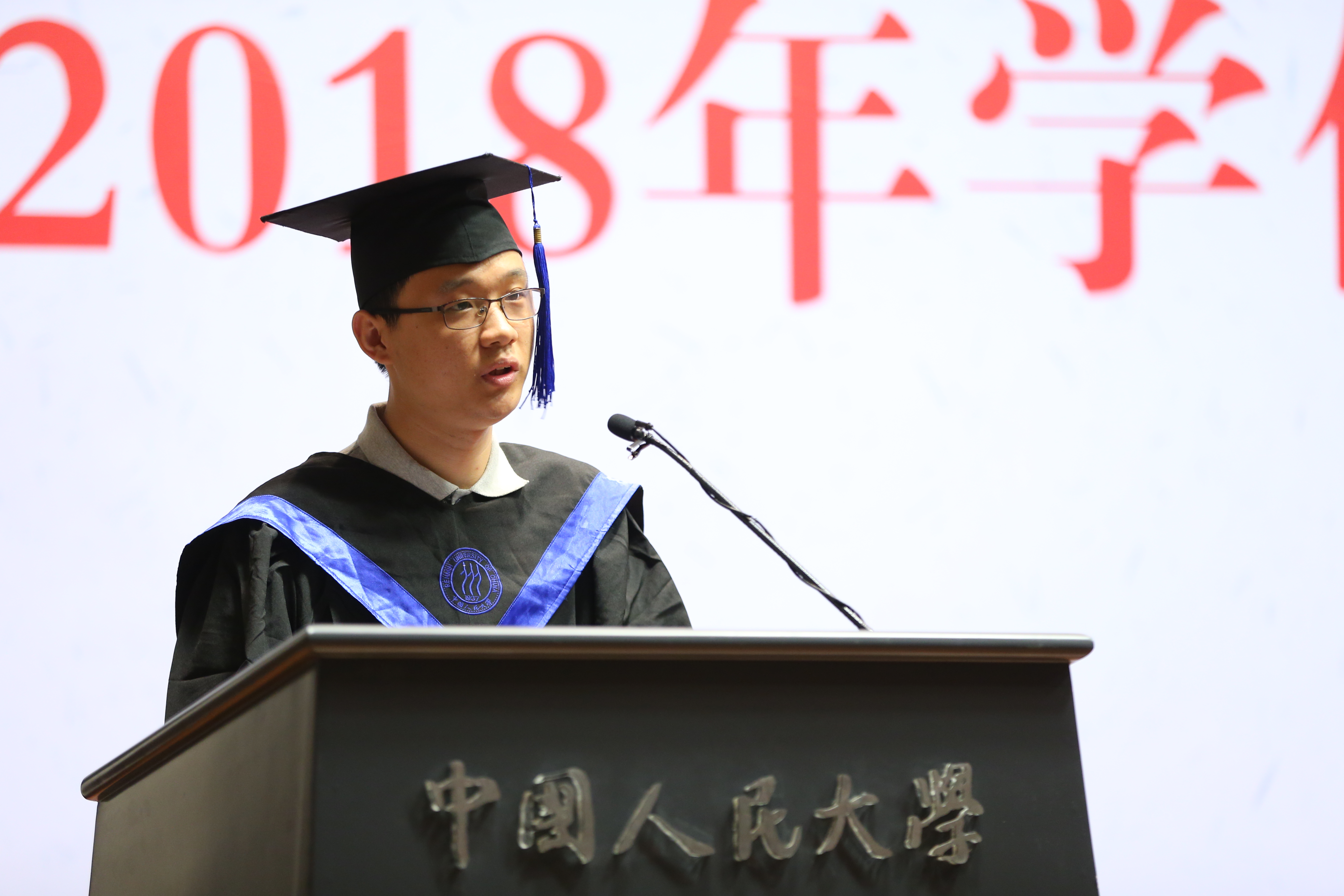 随后,毕业生代表2016级硕士生曲祯朋同学发言。他将毕业离校之际的感受总结为两个关键词——感谢、珍惜。他感谢黑料不打烊 给予他的机遇,感谢老师们的谆谆教诲和同学们的帮助,并希望毕业生能够珍惜曾经的记忆,珍惜曾经拥有的理想。