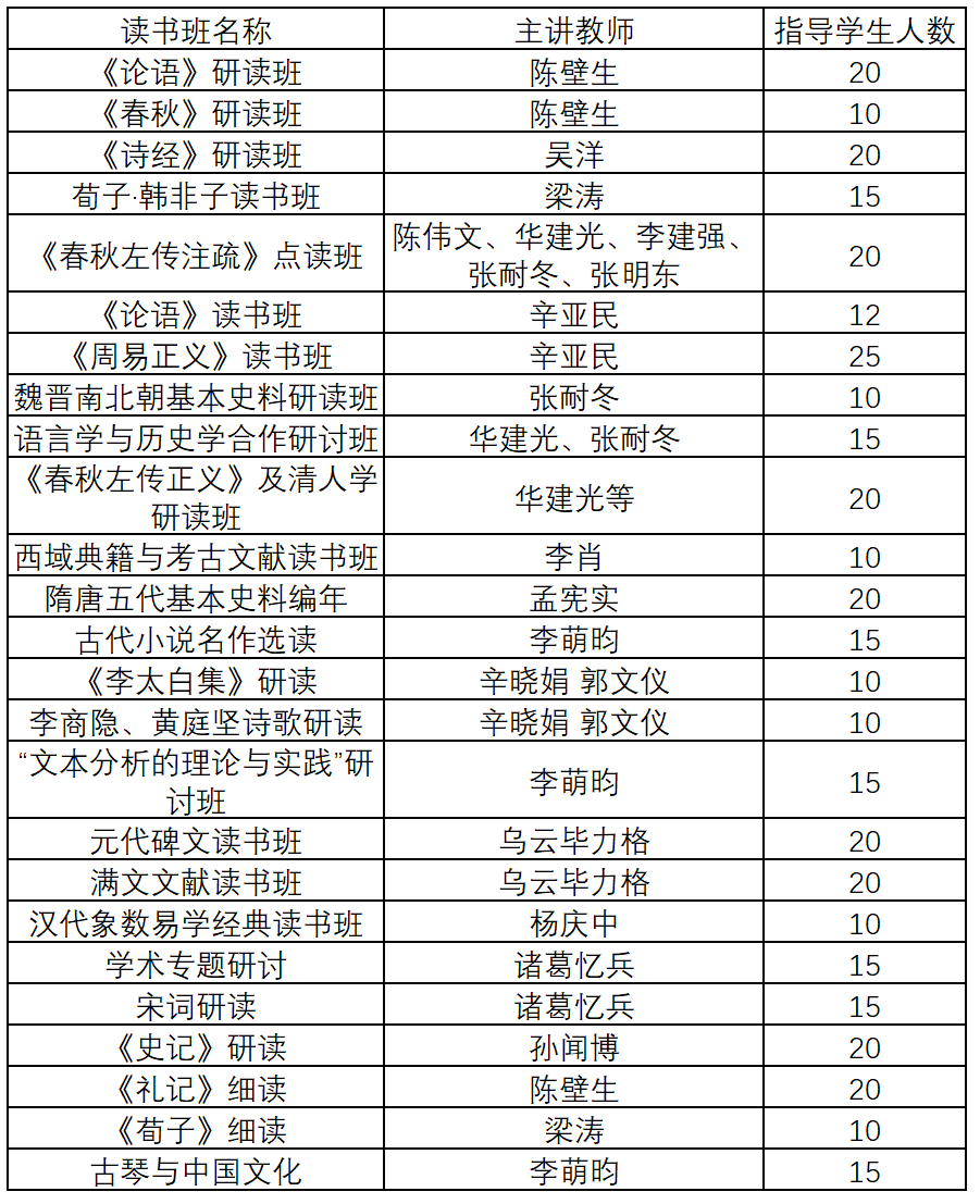 1.原典研读课程。立足于国学原典,将各种研究方法、考察角度相结合,培养学生自主发现问题、解决问题的学术能力。 已开设课程包括“《周易》研读”“《论语》研读”“《孟子》研读”“《老子》研读”“《庄子》研读”“《左传》研读”“《史记》研读”“《诗经》研读”“《红楼梦》研读”等。