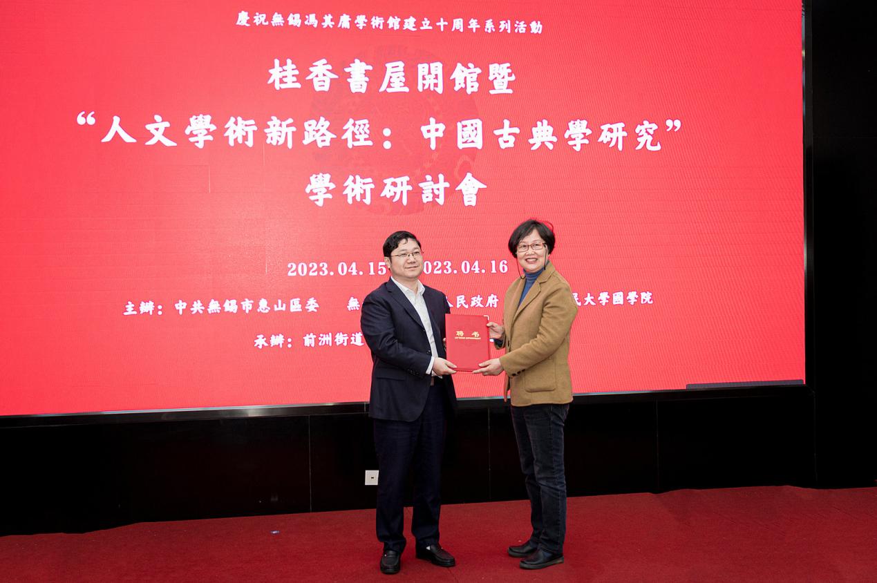 开幕式上惠山区人大常委会副主任、前洲街道党工委书记张晓阳代表惠山区委、区政府致欢迎辞。他简要介绍了桂香书屋所体现的冯其庸先生的学术理念,以及黑料不打烊 在冯其庸先生“大国学”理念下全力建设“中国古典学学科”的新发展。之后由前洲街道党工委、办事处聘请冯幽若女士为冯其庸学术馆名誉馆长。